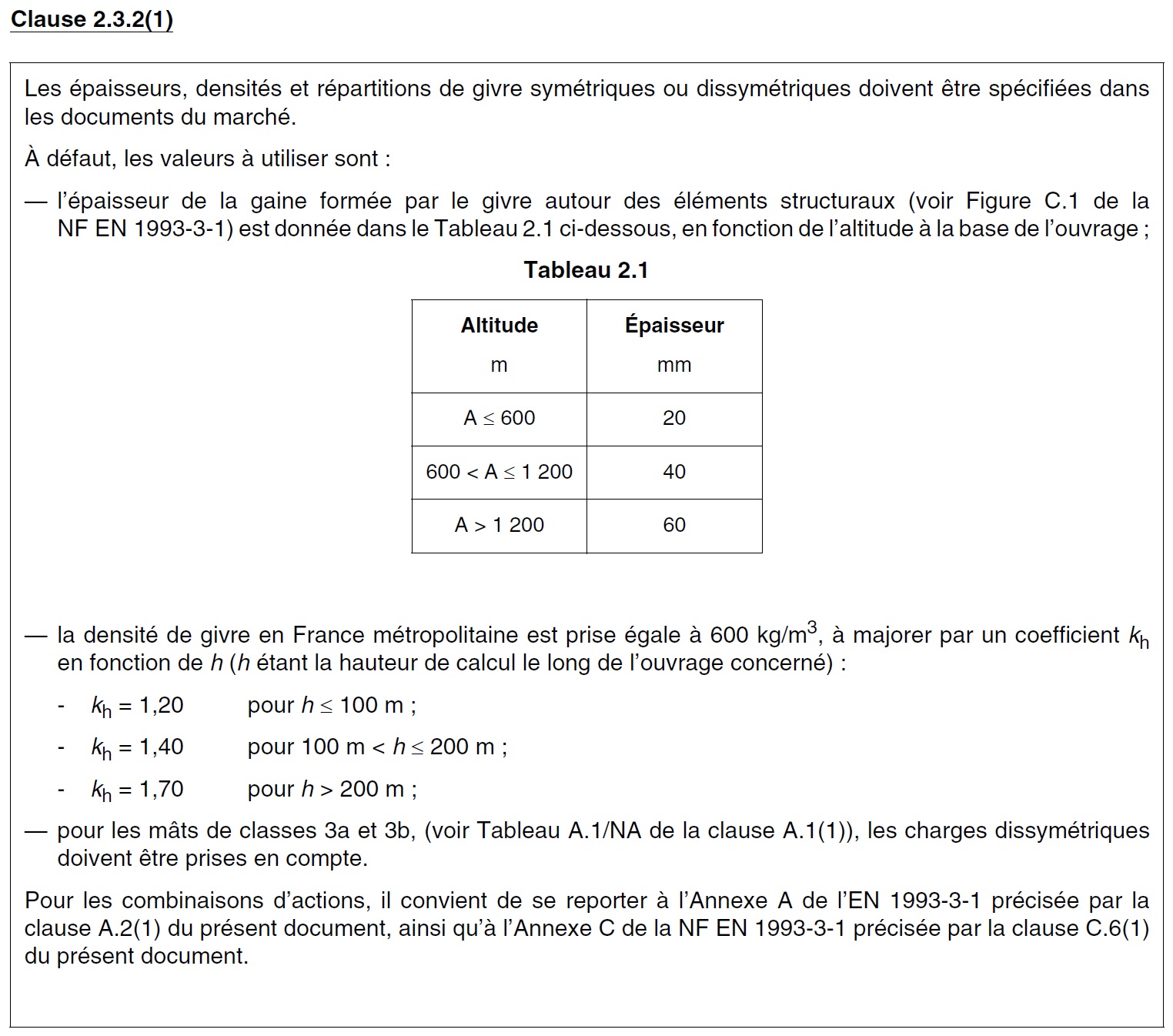 Les surcharges de givre et action du vent font partie du même cas de chargement car il n'est pas physiquement possible d'obtenir une action du vent augmentée par les manchons sans présence du givre.